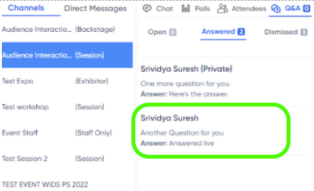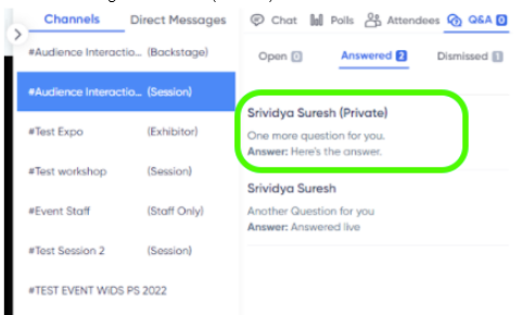 Attendees can also send you messages privately, to answer these questions, the speaker only can answer in chat or dismiss the question, there is no option to answer it live.