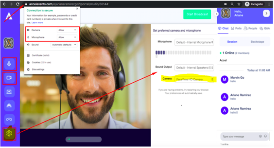 Additionally, make sure that your browser allows camera and microphone access and check the volume and camera output settings of your Accelevents Studio.