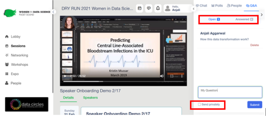 Attendees can write their questions on chat with the option to see their name publicly or can send their questions privately (anonymously). Answers can be seen in the “Answered” subtab under the Q & A tab. Any unanswered question would be visible in “open” tab. And dismissed questions would be seen in “Dismissed” tab.