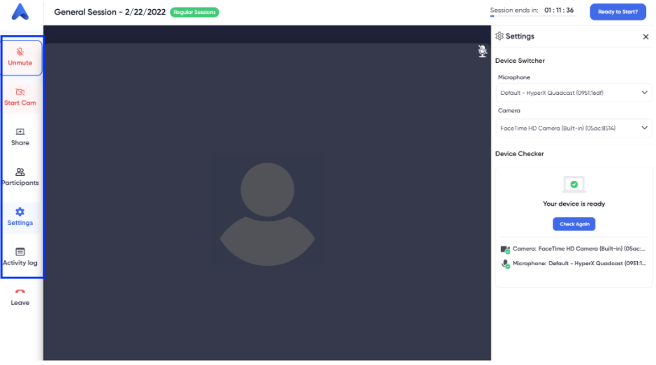 When you are ready to start your talk, you can click the "My Speaking Schedule" button - this will take you to the backstage link or Accelevents studio page Backstage link or Accelevents studio page is to start your live broadcast. When this page opens, you will be asked to set up your camera and mic to prepare for your talk. You can adjust your audio & video settings. You can also upload materials/media or share your screen by clicking the “Share” icon.