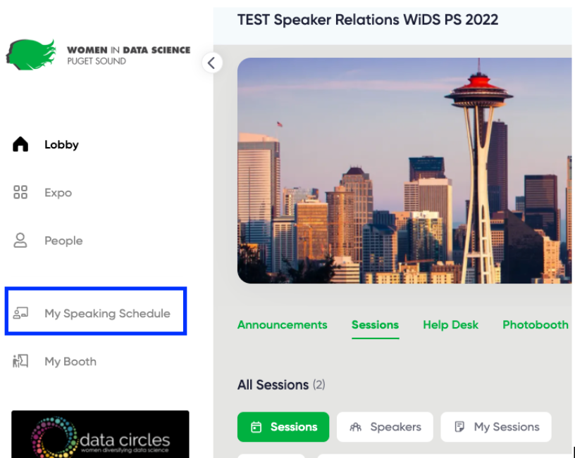 Once you come to the event page by clicking on the link you receive in the invitation email, click on the “My Speaking Schedule” tab on the left side of the panel. This tab will show you all the sessions that you are involved in as a speaker.